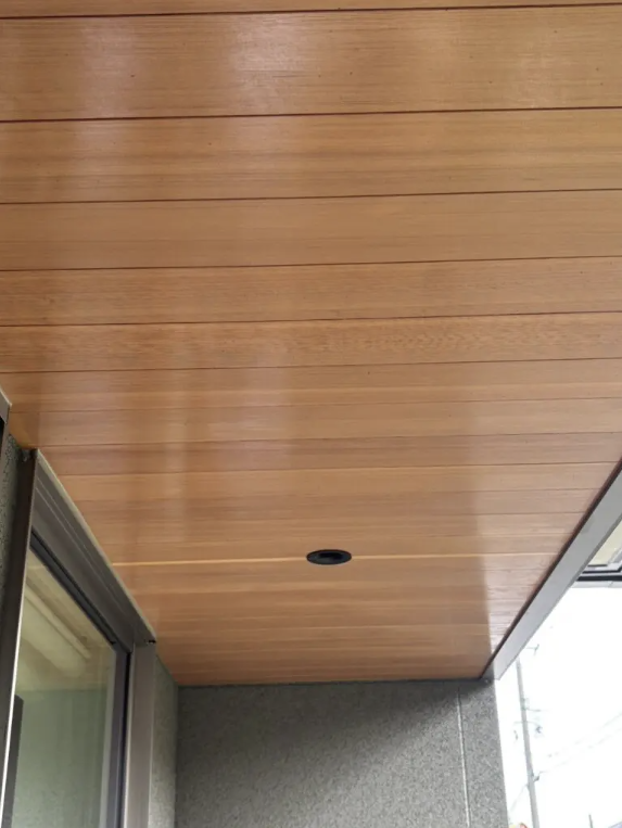我が家は、リビングから外部の庭先に出たデッキ部分の天井に松系の『ピーラー』という木の羽目板を貼りました。