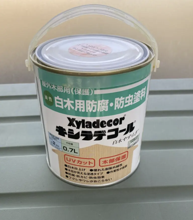 今現在我が家では、木の本来の色をそのままに保ちたく、色は付けず透明なクリアタイプを塗っています。塗料はホームセンターで購入可能です。年数が経ち、色がグレーなりになってきた場合は、茶色等の色を付けることも可能です