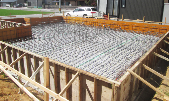 建物の地盤全体に鉄筋を配置して、そこにコンクリートを流し込むベタ基礎を採用しています。