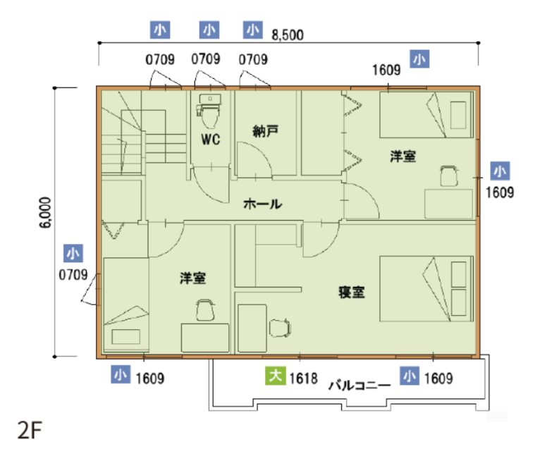 ※延べ面積32.50坪(1F 16.6375坪、2F 15.4275坪)、窓数17本の場合