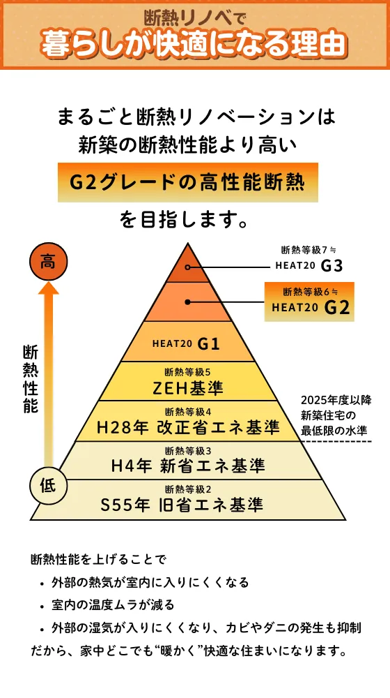 ・足元からポカポカ暖かいお家で過ごせる ・光熱費をぐっと抑えられる ・温度差やカビの抑制で家族が健康的に暮らせる ・性能もデザインも諦めず、私らしい家になる ・断熱性や耐震性が向上し築古でも安心できる