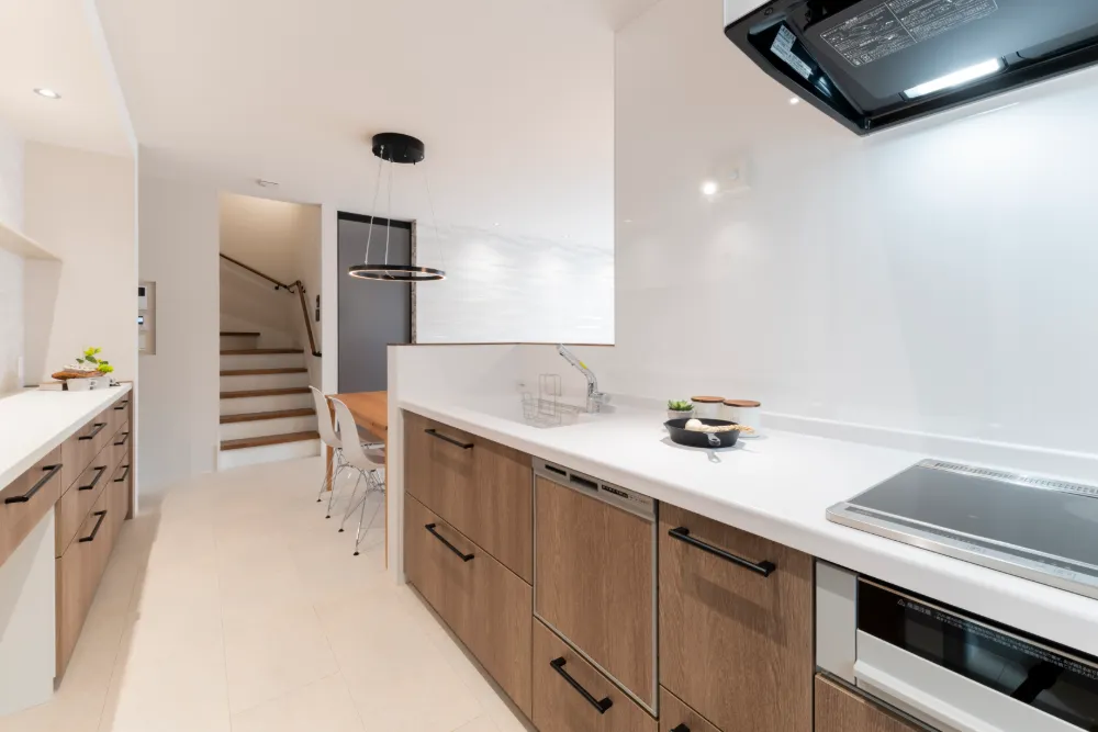 半独立型のキッチンは、生活感の出るシンクまわりをかくしつつ、リビングの気配を感じながら、調理を楽しむことができます。