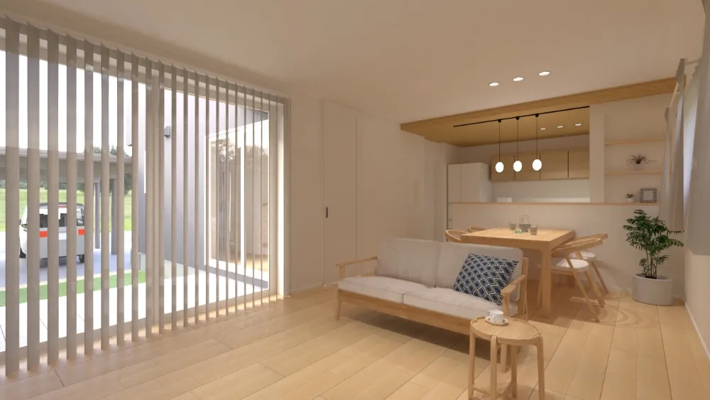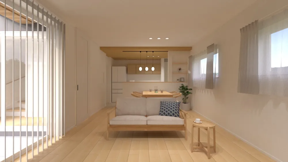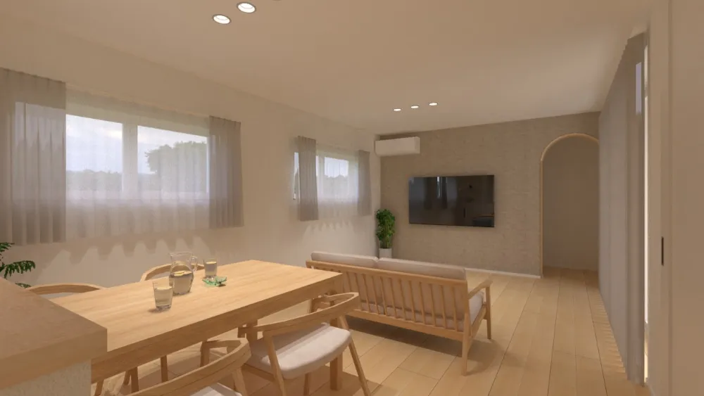 奥様の好きなナチュラルテイストをベースに、やわらかな木目や淡い色合いでまとめた空間。 そこに、ご主人の好みを反映したモルタル調のアクセントクロスをテレビ背面に採用し、さりげなく引き締めました。 やさしさの中に、ほんの少しのかっこよさを。 ご夫婦それぞれの感性が重なり合い、バランスの取れたナチュラルモダンな住まいに仕上げています。 リビングの掃き出し窓には、タチカワブラインドの「エアレ」を採用。 陽の光をやわらかく通し、風にふわりとなびくその姿が、空間に静かな美しさを添えます。 日常を過ごす場所だからこそ、心が落ち着く心地よさを大切にしました。