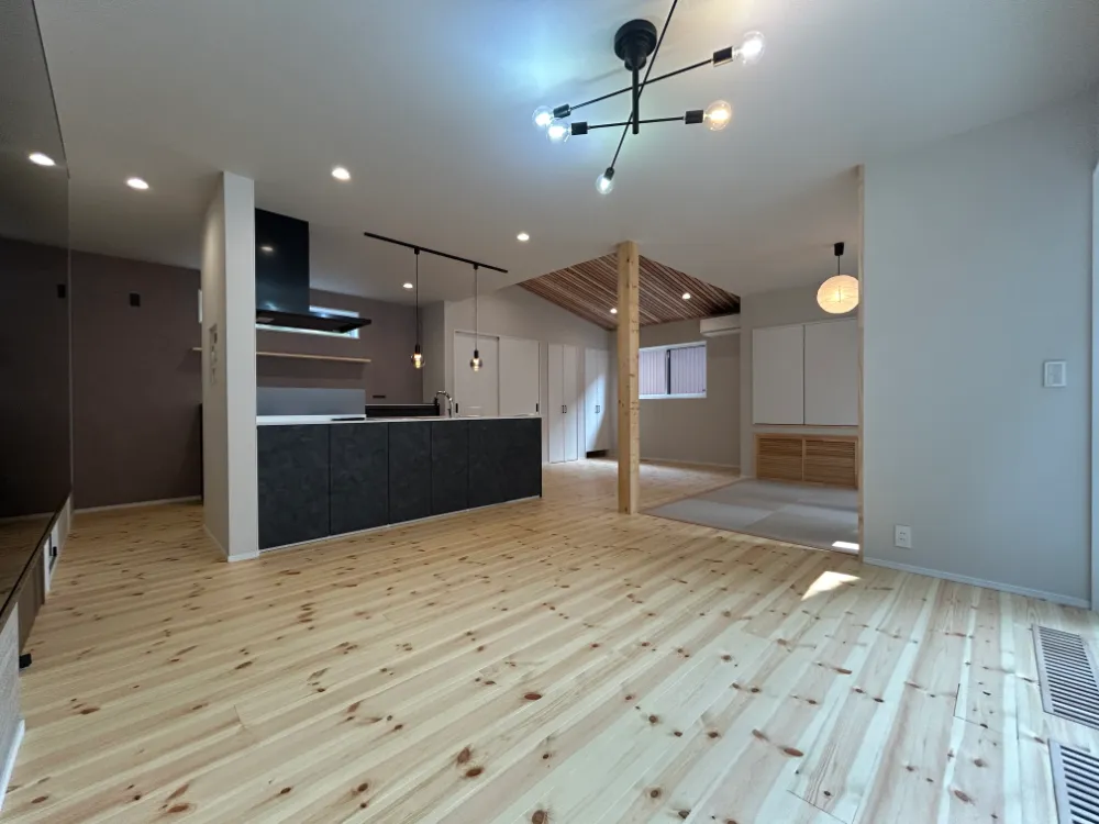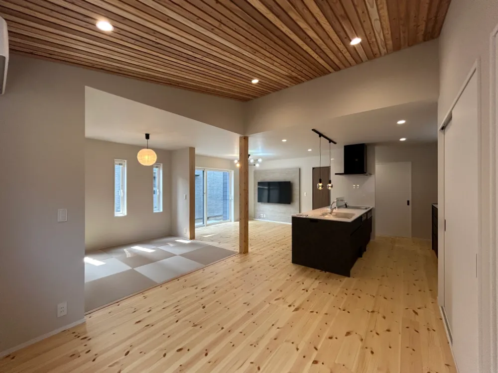 キッチンからリビングへ、そして畳の間へと連なる視線は、家族の気配を自然に結び、ひとつの空間に多様な居場所をつくり出しています。