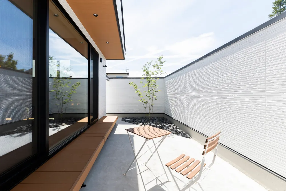 プライベートテラスと大人っぽいナチュラルテイストが魅力の、平屋