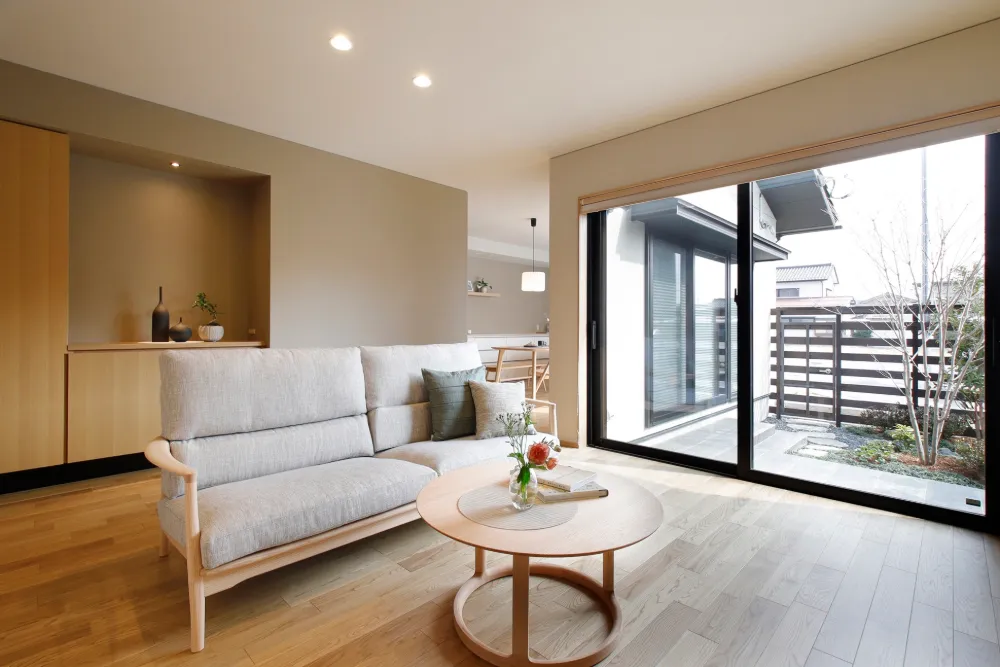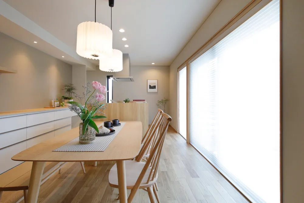 ベージュと明るい木目を基調として飽きのこないデザインにしました。 和紙調の照明や繊細な造りの家具が相まって、品のある居心地を感じることができます。