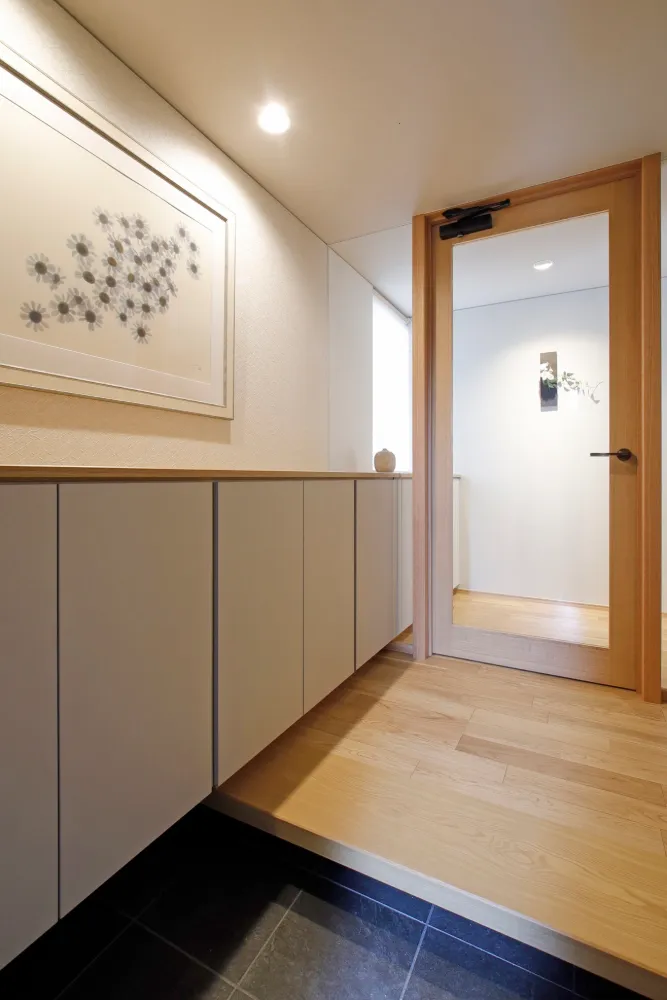 ガラス扉で視線の抜けとデザイン性を叶えました。 たっぷり収納できるシューズクロークのカウンターには絵や植物を自由に飾り、自慢の玄関スペースになります。